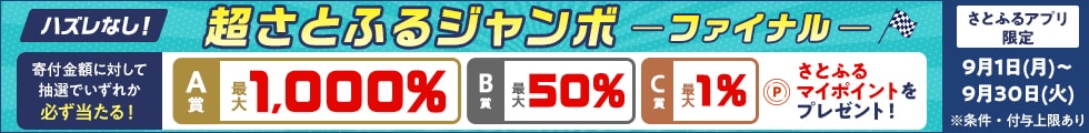 - ※さとふるサイト・PayPay版さとふるおよびYahoo!ショッピング版さとふるでの寄付は対象外です。