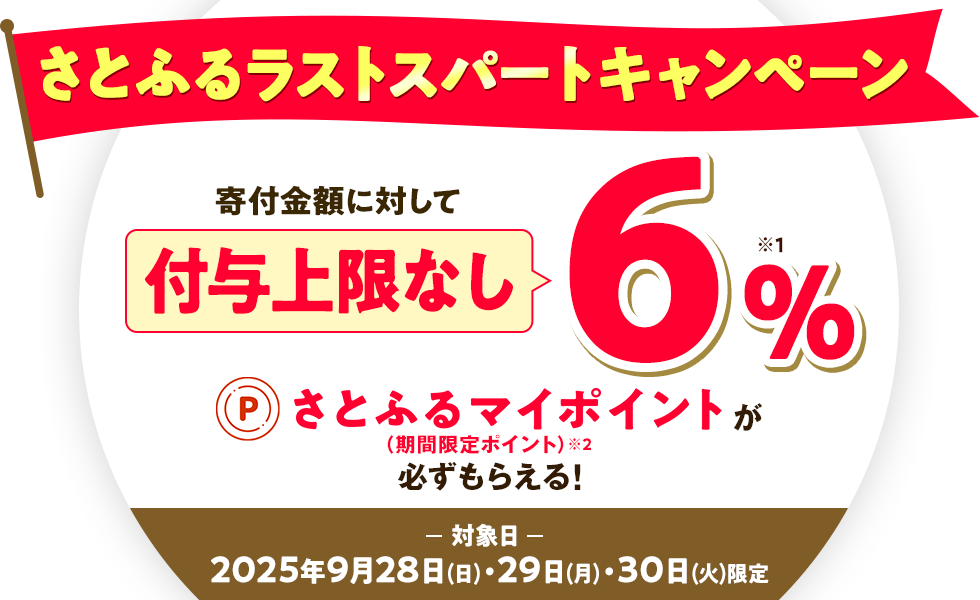 - 1 キャンペーン条件を満たし、2025年9月28日(日)・29日(月)・30日(火)当日中に寄付申込み・お支払いを完了した場合。